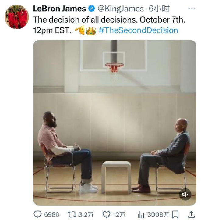 10月7日凌晨,湖人老大詹姆斯突然更新了推特动态,他写道:“所有决定中的决定,10月7日,美东时间中午12点。#决定2”换算成北京时间即明天凌晨0点。