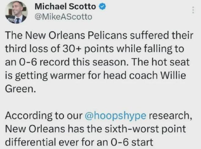 总之,鹈鹕倾尽心血的交易引援投入,换回的却是令人大失所望的结果,他们的主帅威利-格林很有可能是本赛季第一个下课的教练,要么直接干脆全队摆烂重建。