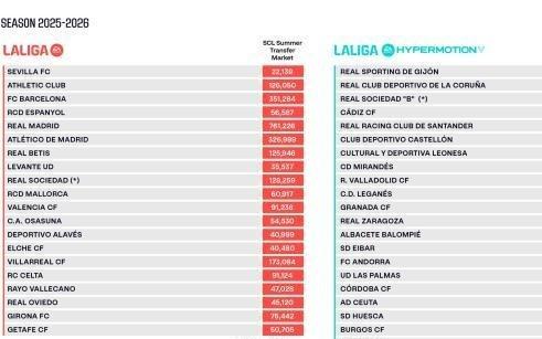 西甲“工资帽”出炉:皇萨竞稳定包揽前三