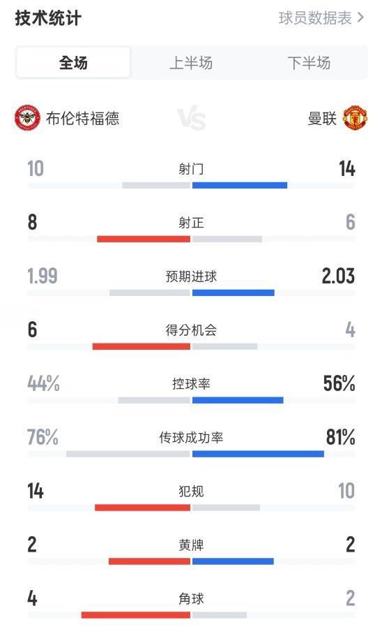 布伦特福德31曼联数据:射门1014,射正86,控球率44%56%
