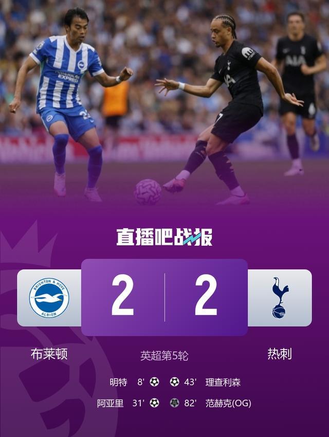 英超热刺让2追2战平布莱顿理查利森破门范赫克乌龙阿亚里世界波