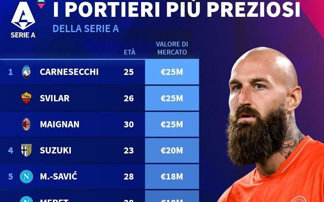 意甲门将身价前10:迈尼昂等3人2500万第1,铃木彩艳2000万第4