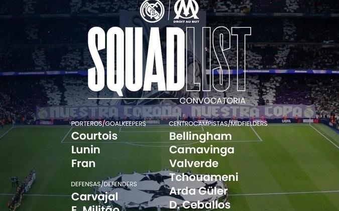 皇马欧冠对阵马赛大名单:姆巴佩领衔,贝林厄姆、卡马文加在列