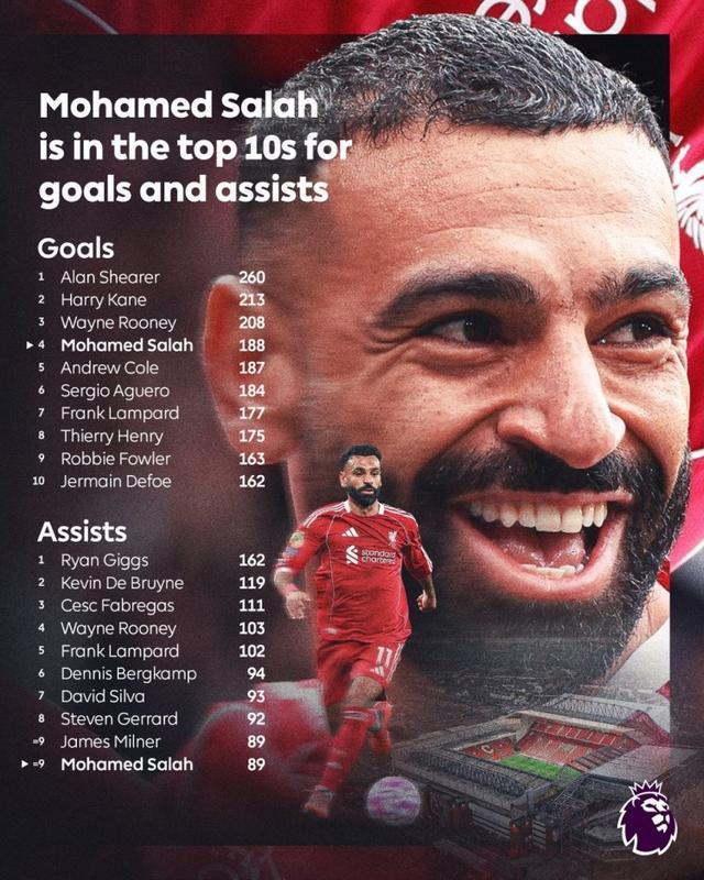 188球+89助攻!萨拉赫位列英超历史射手榜第四、历史助攻榜第九