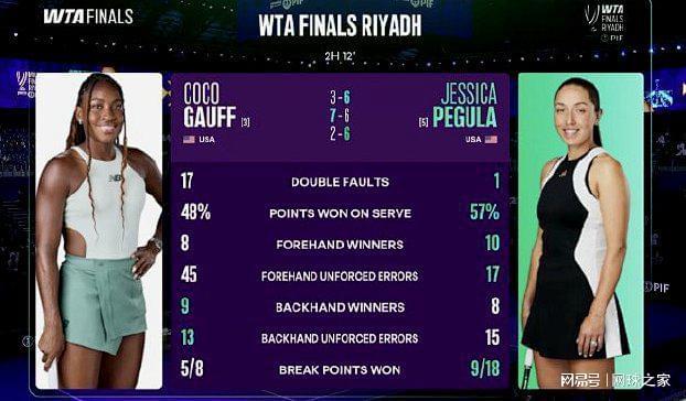 而卫冕冠军、3号种子高芙则被5号种子、同胞佩古拉以6-3 6-7(4) 6-2击败,无缘首胜。在这场对决中,高芙手感冰凉,全场发出了17个双误,非受迫性失误高达75个,15个发球局被9次破发,几乎是送给对手一场胜利。