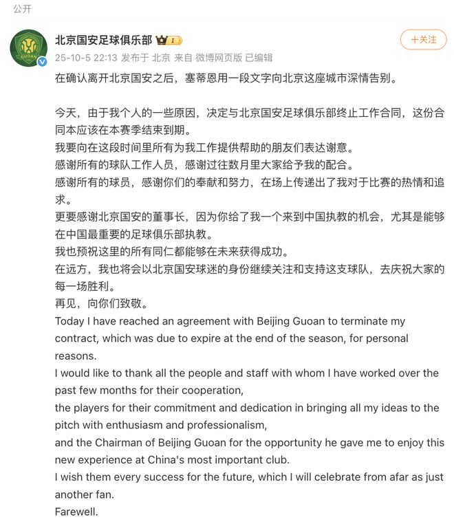 新京报讯 据@北京国安足球俱乐部 消息,在确认离开北京国安之后,塞蒂恩用一段文字向北京这座城市深情告别。