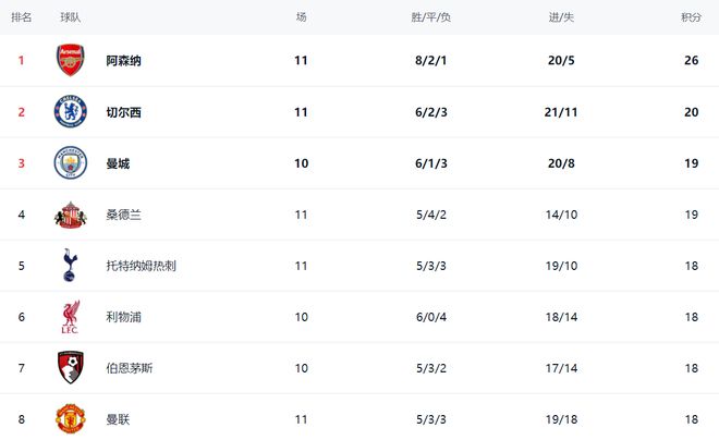 在积分榜上,阿森纳依然占据榜首位置,拿到了26分。切尔西赢球之后,暂时升到了第2的位置,拿到20分,与阿森纳有6分的差距。曼城19分排名第3。不过,曼城少踢1场。桑德兰这匹黑马也是19分,排名第4。热刺、利物浦、伯恩茅斯和曼联这4支球队都是18分,排名第5到第8。水晶宫以16分排名第9。