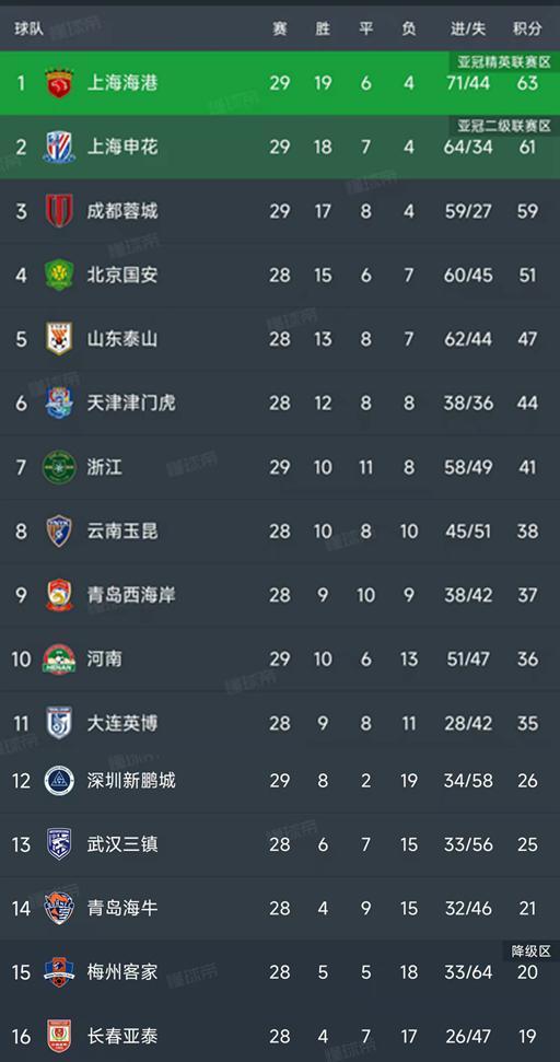 由于蓉城输球,申花排名升第二名,同时仅仅落后海港2分,依然有夺冠的可能性。最后一轮,申花的对手是客场PK天津津门虎,除了自己要拿到三分,还要希望大连英博能爆冷战胜上海海港。上赛季的申花落后海港1分屈居亚军,这个赛季他们能改写命运吗?输球的深圳新鹏城以26分暂列第12名,基本保级成功!